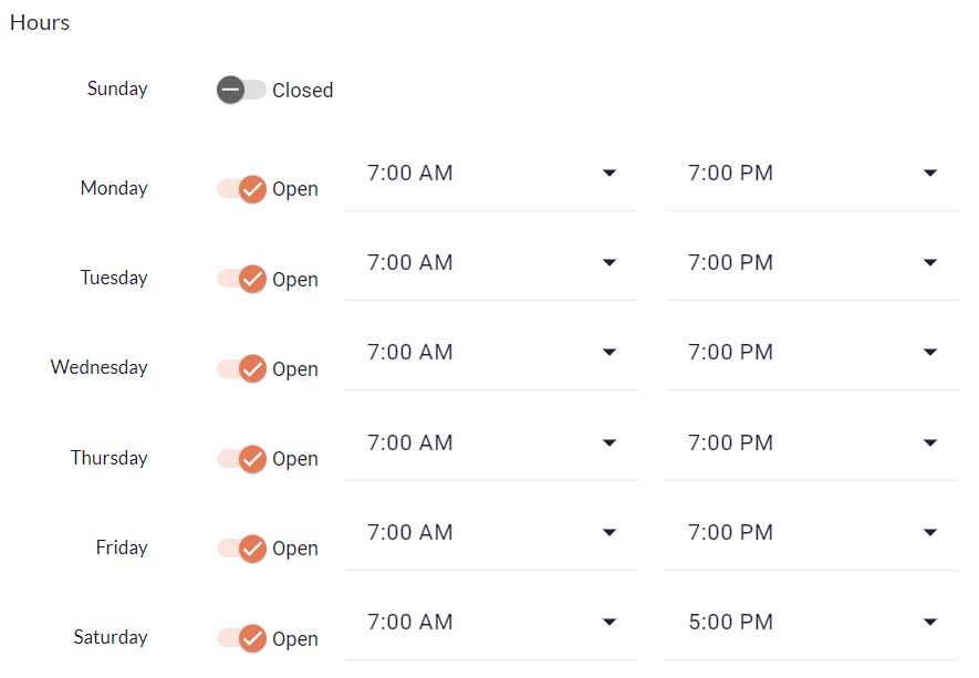 From this page, you'll be able to decide on the after-hours windows for each individual day of the week. Click on the dropdown and select the best times for this location.