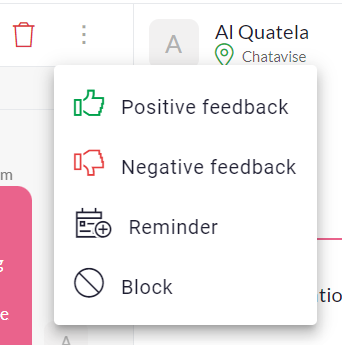 If you'd like to block a contact's number, click on the contact's chat history from the Chats page. Click on the three dots menu beside the trash can icon at the top right of the chat history.