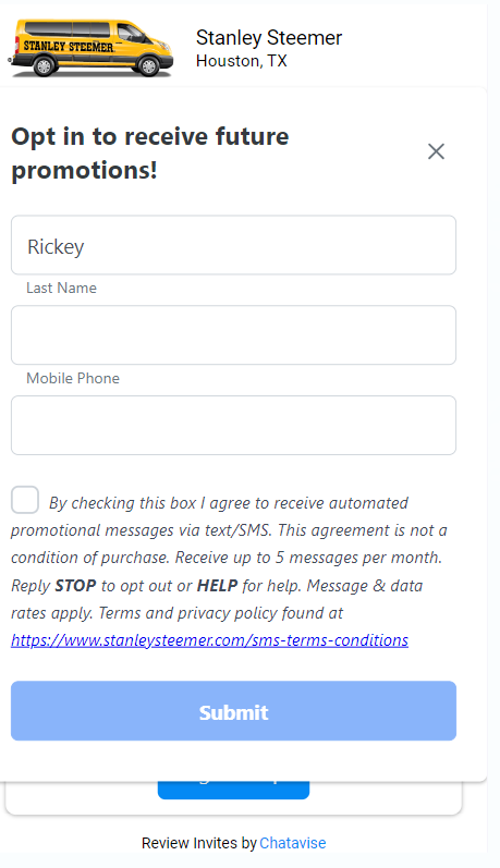 Here's an example of the final result. This is what customers will see whenever they've hit thumbs up on the soundingboard and are prompted to leave a review and to sign up for promotional messaging.