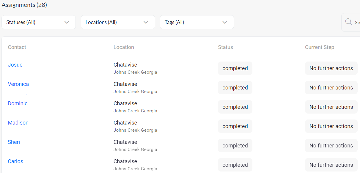 You can filter out these contact assignments by location, status, or tag, or you can search for the contact either by name or by phone number as well.